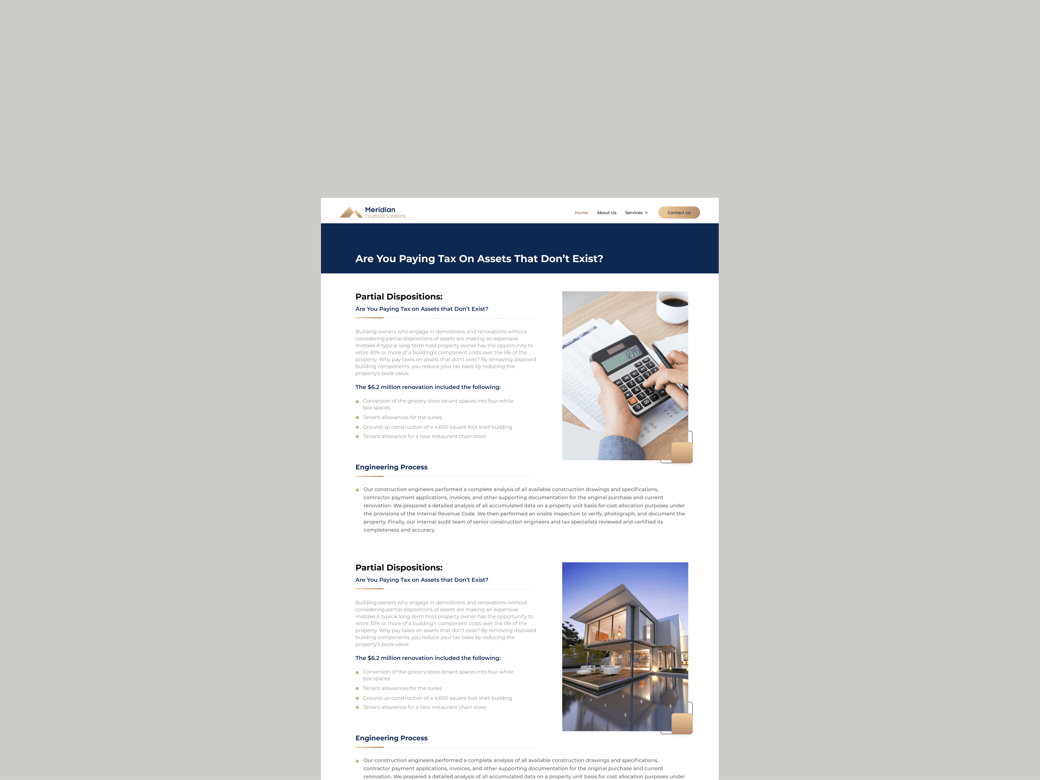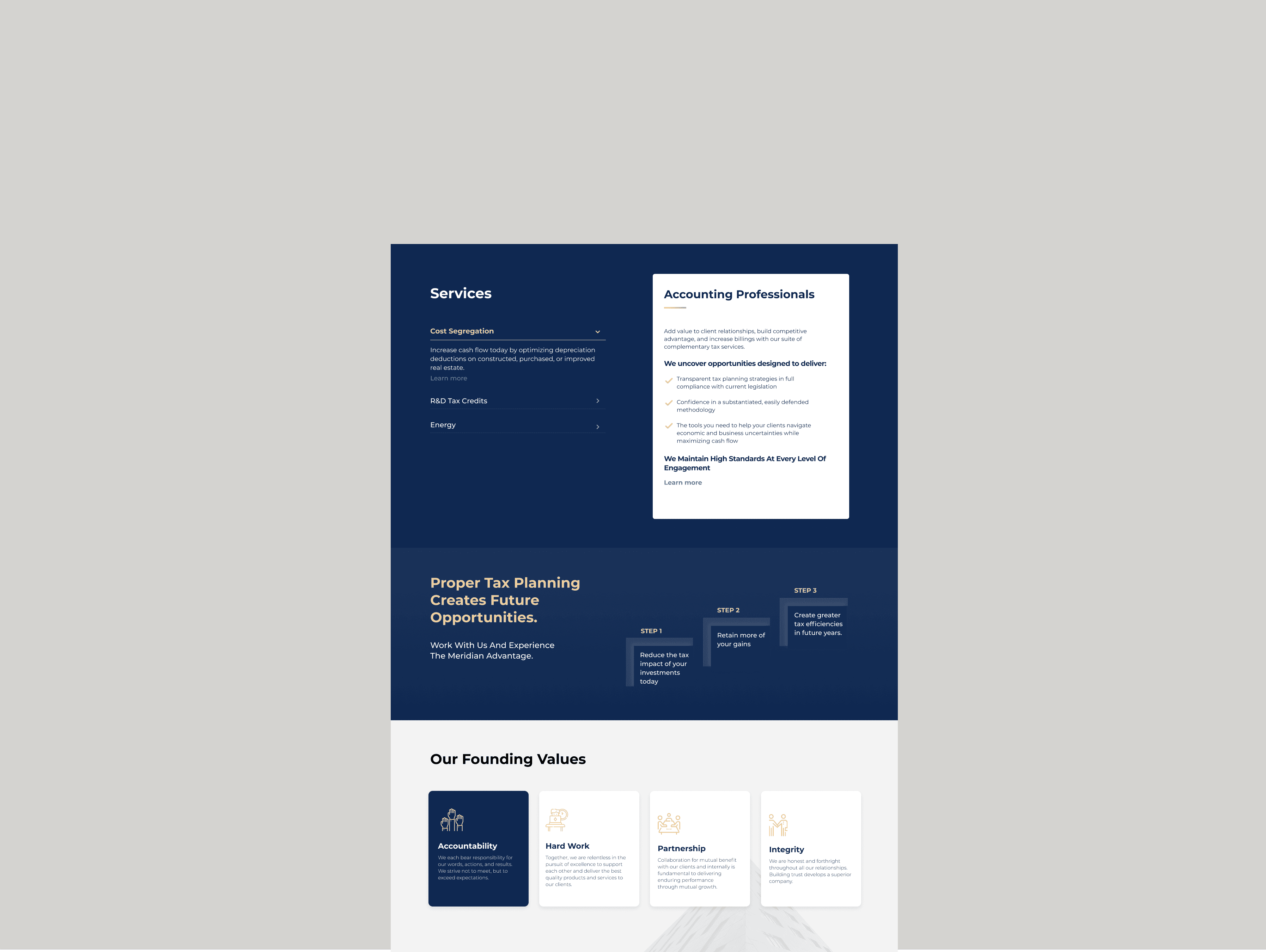 Following the redesign of Meridian’s website, we observed a noticeable uptick in client interest and interaction. The streamlined layout and strategic content placement led to higher page retention, improved lead quality, and increased trust from target audiences—positioning Meridian as a credible authority in niche financial and tax solutions.